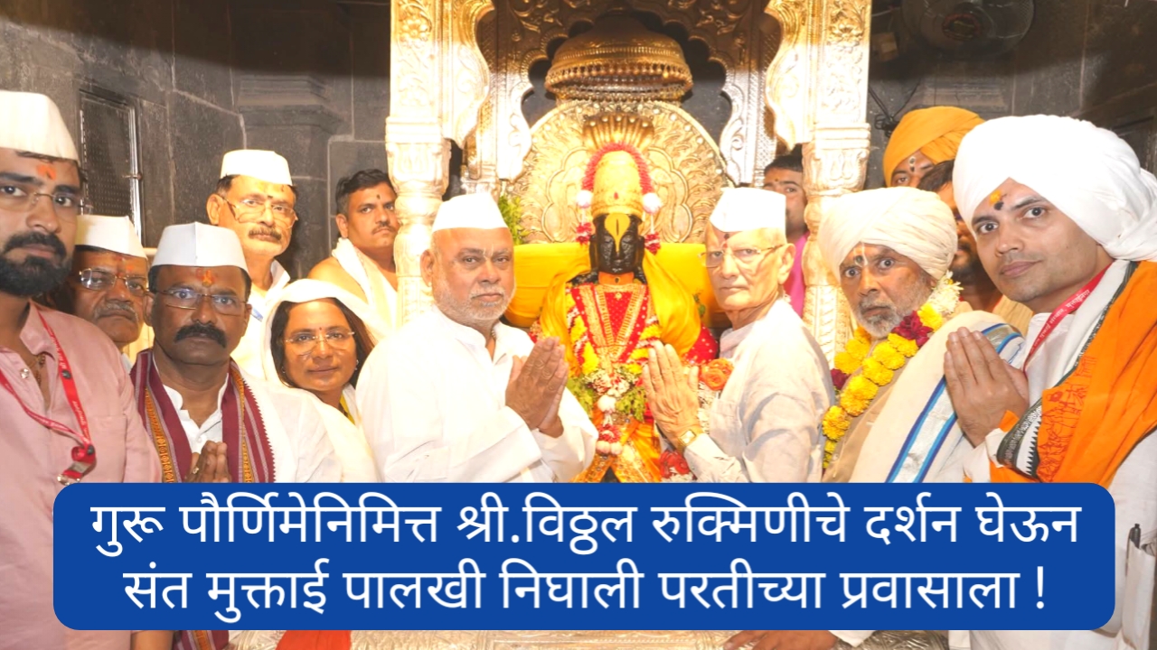 जळगाव जिल्ह्यातील श्री.संत मुक्ताई समाधी स्थळ कोथळी श्रीक्षेत्र मुक्ताईनगर येथून दिनांक ६ जून २०२५ रोजी आषाढी वारीनिमित्त श्री.संत मुक्ताबाई पालखी सोहळा श्रीक्षेत्र मुक्ताईनगर ते श्रीक्षेत्र पंढरपूर असा सर्वांत लांबचा असलेला हा पालखी सोहळा दिनांक ३ जुलै २०२५ रोजी पंढरपुरात पोहोचला होता. यानंतर नित्य भजन ,कथा, किर्तन असे नित्योपचार आटोपल्यावर आज दिनांक १० जुलै २०२५ गुरुवारी, गुरुपौर्णिमेच्या शुभ मुहूर्तावर गोपाळकाला येथे संत भेटी व काल्याचे किर्तन आटोपल्यावर पुन्हा श्री.विठ्ठल रुक्मिणी मंदिरात येऊन विठ्ठल भेटीसाठी आलेल्या संत मुक्ताई माऊलींच्या पादुका रूक्मिणी मातेच्या भेट घेतली. दुपारी नैवेद्य – जेवण होऊन पालखीने परतीच्या प्रवासाला सुरुवात केली .